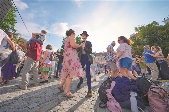 近日,波兰华沙举行庆祝老城战后重建系列活动,包括街头爵士乐舞会、音乐会和主题展览等。图为人们在华沙老城露天爵士乐舞会上跳舞。新华社发(亚普·阿林 摄)