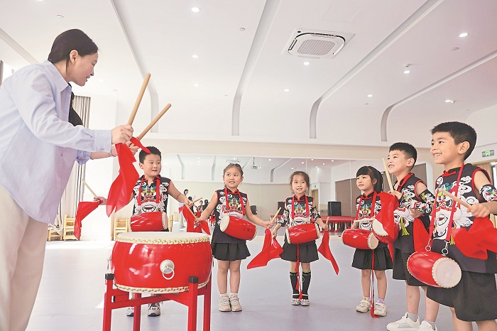 7月21日,“小候鸟”在浙江省湖州市德清县乾元镇恒星幼儿园练习打腰鼓,感受传统文化的魅力。