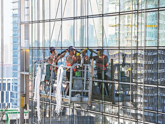 连日来,合肥地区持续高温,户外作业面临严峻考验。图为中建二局安徽分公司建设者在合肥科大硅谷高新孵化园一期项目开展幕墙作业。范柏文 摄