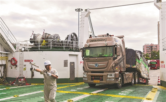 7月22日,在海南省海口市秀英港,货车在工作人员指挥下驶入客滚船。