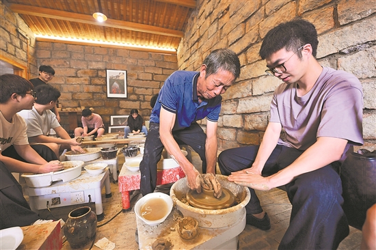 7月18日,在福建省周宁县浦源镇萌源村月山古龙窑制作间,萌源制硋世家第七代传人肖家涨(左)在向前来参观研学的学生演示拉坯制硋技艺。