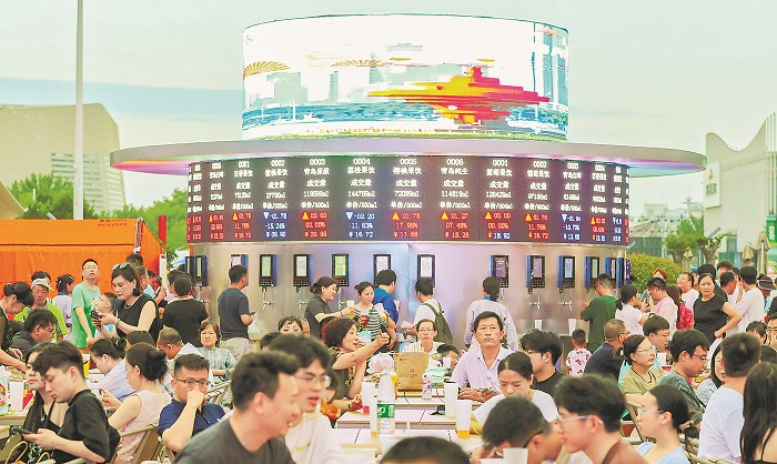 据运营方介绍,系统会根据销量实时调整啤酒“股价”。该动态定价机制结合沉浸式体验,打造消费新场景,凸显节庆特色。