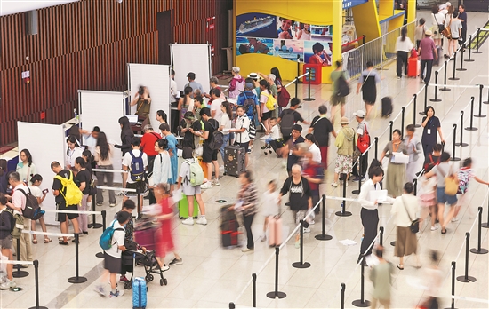 7月23日,旅客在天津国际邮轮母港办理登船手续。今年7月以来,天津邮轮口岸累计查验出入境人员近4万人次,邮轮16艘次,较去年同期均增长了17%。