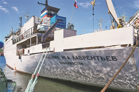 “中俄联合海洋科学考察”启动仪式当地时间7月22日在俄罗斯符拉迪沃斯托克举行。两国科研人员于23日乘坐俄“拉夫连季耶夫院士号”科考船出发,赴白令海和太平洋西北部海域开展科考活动。图为近日在俄罗斯符拉迪沃斯托克拍摄的“拉夫连季耶夫院士号”科考船。新华社发(郭飞洲 摄)