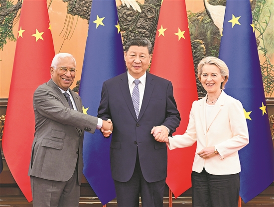 三是践行多边主义,维护国际规则秩序。面对战争与和平、竞争与合作、封闭与开放的重大选择,多边主义、团结合作才是正确答案。中欧要共同维护第二次世界大战结束后建立起来的国际规则和国际秩序,与时俱进推动构建更加公正合理的全球治理体系,携手应对气候变化等全球性挑战,让多边主义的火炬照亮人类前行之路。中欧要支持通过政治手段和平解决国际争端。中方一贯从事情本身的是非曲直出发,主张劝和促谈,倡导标本兼治。中方愿同欧方加强协调,推动今年联合国气候变化贝伦大会取得成功,为应对气候变化和全球绿色转型作出更大贡献。中方也愿同欧方开展人工智能领域政策沟通和务实合作,共同推动平等有序的世界多极化、普惠包容的经济全球化。