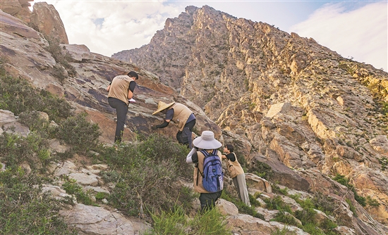 7月23日,工作人员在贺兰山岩画遗址区内进行2025年度岩画复查。