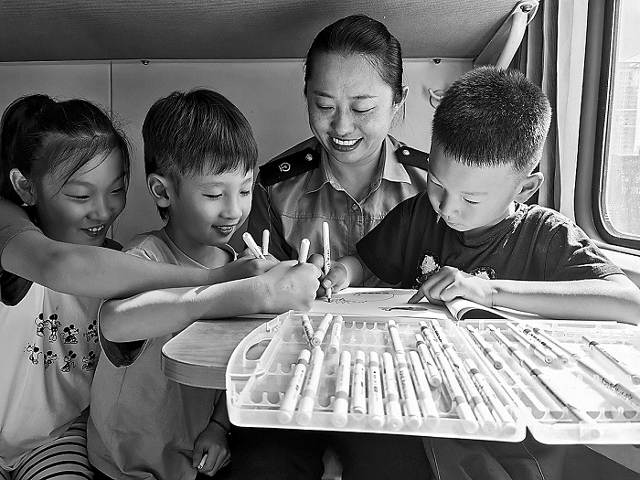 7月17日,在呼和浩特开往温州的K4275次列车上,孩子们在列车员唐丽娜的带领下进行涂色、绘画。