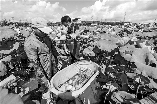 7月23日,种植户在海宁市海昌街道双山村的“武莲海种”荷花基地采收荷花和莲蓬。