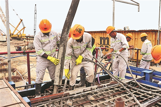 在贝宁科托努的科托努自治港5号码头施工现场,工人对5号码头首段胸墙做混凝土浇筑。新华社记者 司源 摄