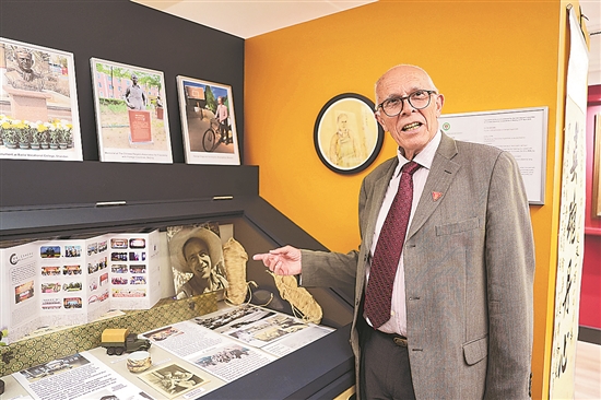 英国记者乔治·何克纪念展近日在英国赫特福德郡哈彭登镇博物馆举行,以追思其为支持中国抗战作出的贡献,共同追忆中英两国在世界反法西斯战争中结下的友谊。图为近日,乔治·何克的外甥马克·艾尔温·托马斯在何克纪念展上向观众解说。新华社记者 吴鲁 摄