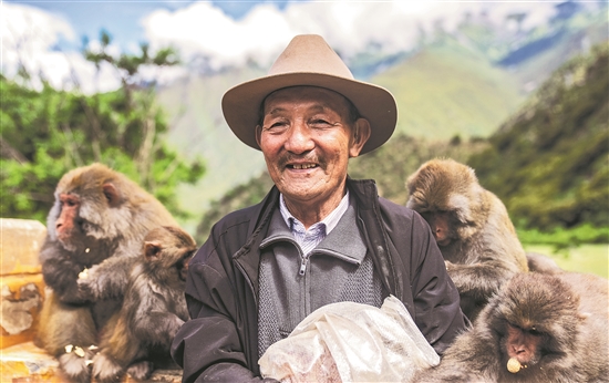 在林则生态文化旅游景区,多布杰老人被藏猕猴围绕(7月23日摄)。