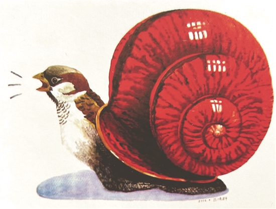 看,这幅漫画表现的,不过是一只小鸟,小鸟的头发,小鸟的眼睛,小鸟叽叽喳喳的嘴。不过再往下看,我们开始怀疑自己的眼睛了,蜗牛的腰身,蜗牛的足,蜗牛的“自建房”。好在我们有“人头马”“鱼尾狮”等视觉经验,不至于被这个怪物惊吓着。说不定,有人看到这个“品种”,会笑出一身冷汗。