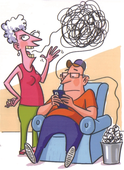 家庭中,妻子整天絮絮叨叨,东家长李家短,丈夫不想与之争辩,只得采取“左耳进,右耳出”的策略应付。
