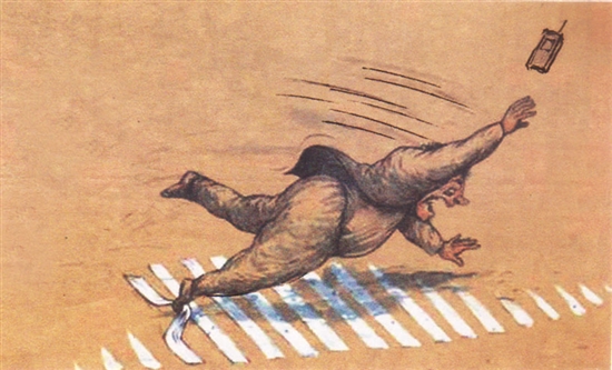 低头族在斑马线上跌跟头,原本不该发生的事故,只因为手机内容吸引主人的注意。“一心不可二用”乃老少皆知的道理。