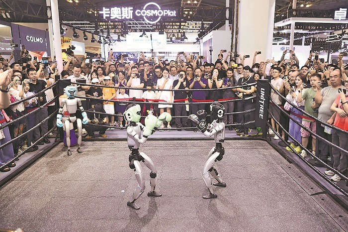 7月26日,2025世界人工智能大会暨人工智能全球治理高级别会议在上海开幕。大会展览面积首次突破7万平方米,吸引800余家企业参展,展出3000余项前沿展品。图为宇树科技展台,机器人正在进行拳击赛。本报记者 刘金梦 摄