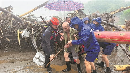 7月27日上午,北京密云消防救援支队水域救援突击队协助石城镇高家岭村转移受灾群众。本报记者赖志凯 摄