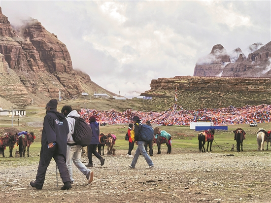 7月21日,在西藏自治区阿里地区冈仁波齐山脚下,不少中外游客在徒步转山。