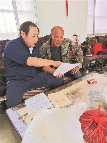 图为近日,山东省济南市长清区孝里街道北黄崖村驻村第一书记王军利,在为村民程安路家的果树种植作规划。