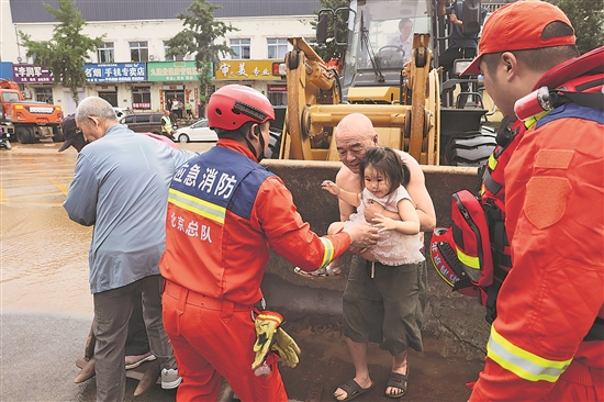 参与救援的志愿者崔孔齐站在一辆大型铲车上擦了擦脸上汗水告诉记者:“早上7点开始和司机李金奎就过来转移受困群众,往返跑了七八趟了。确实累,但看到大家都在齐心协力抗灾,心里就充满了力量。”