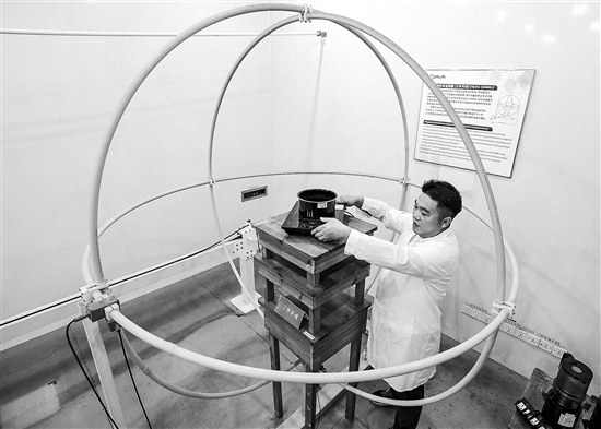 图为7月24日,技术人员在新宝股份认证测试中心运用三环天线测量电磁炉磁场感应电流。