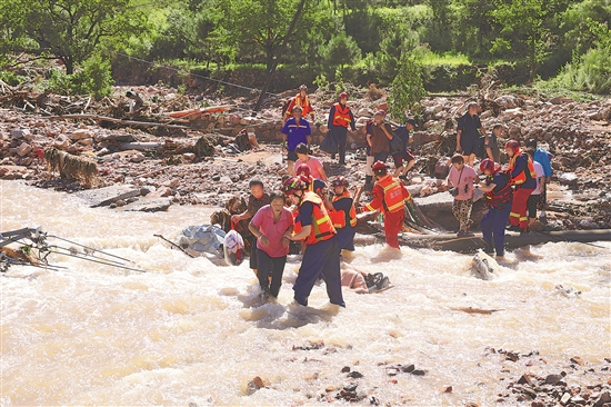 7月29日下午,在北京市密云区大城子镇下栅子村附近的红门川河,救援人员在转移被困群众。本报记者 窦菲涛 摄