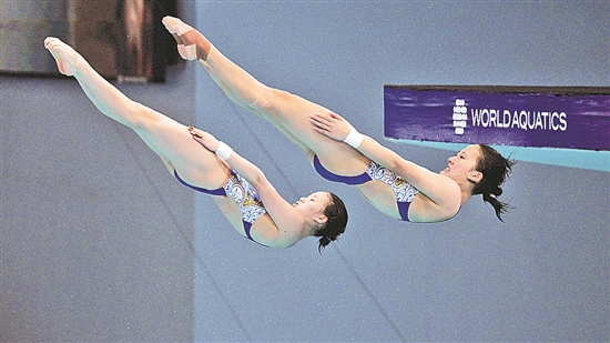 当地时间7月28日,在新加坡举行的2025年世界游泳锦标赛跳水女子双人10米台决赛中,中国组合陈芋汐/掌敏洁夺冠。图为陈芋汐(左)/掌敏洁在比赛中。 新华社发(邓智炜 摄)