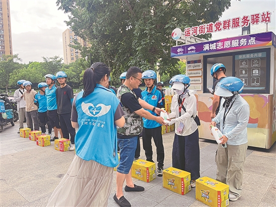 近日,在浙江省杭州市临平区梅堰社区邻里中心爱心驿家,临平区总工会向新就业形态劳动者送上“爱心清凉包”。今年,临平区总筹备了1700份清凉物资,慰问新就业形态劳动者等群体,帮扶困难家庭。本报记者 邹倜然 本报通讯员 俞燕燕 摄