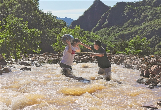 7月29日,在与北京市密云区下栅子村紧邻的河北省兴隆县杨家台村,两名村民在河滩上发现一个被洪水冲下来的燃气罐,相互帮助搬运过河,准备扛到安置点供大家应急使用。