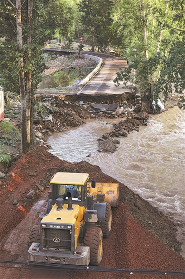 7月29日,北京市密云区瓦窑沟桥下,推土机正在抢修被洪水冲毁的道路。