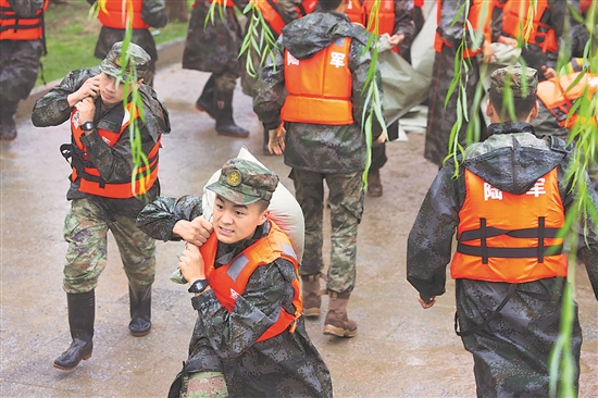 7月29日,北京市密云区的潮河水位上涨,北京卫戍区某部官兵在雨中紧急加固堤坝。