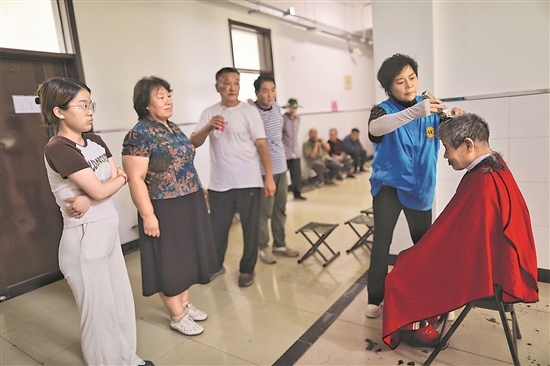 7月30日,在北京市怀柔区最大的受灾群众安置点,当地工会组织理发师为受灾群众免费理发。