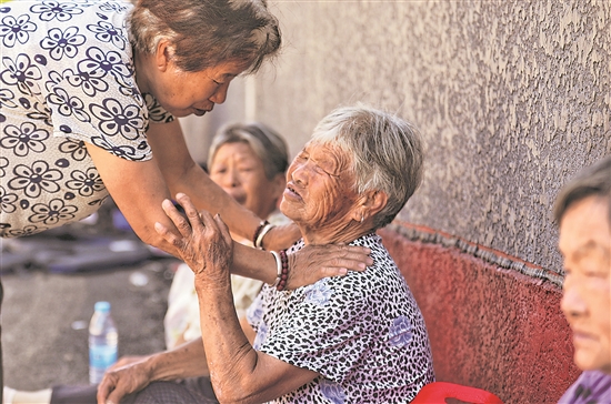 7月30日,在北京市怀柔区龙泉峪村,刚刚从受灾的家里转移下来的两位老人相互安慰。