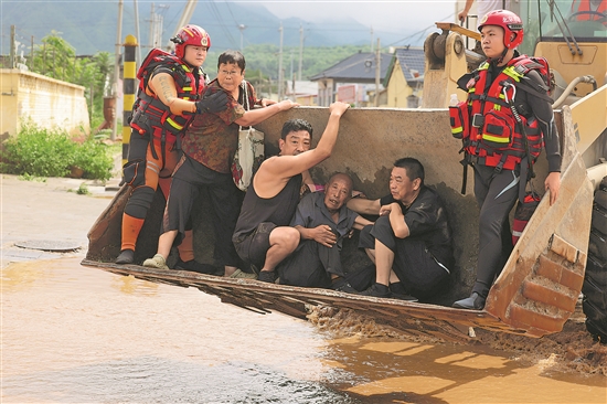 7月28日,北京市密云区太师屯镇葡萄园村,救援人员正用铲车转移群众。