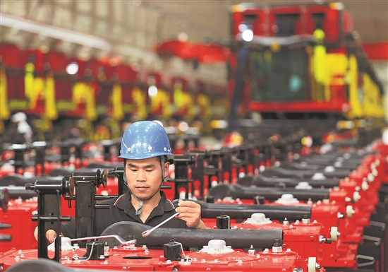 7月28日,工人在新疆钵施然智能农机股份有限公司的采棉机生产车间组装配件。