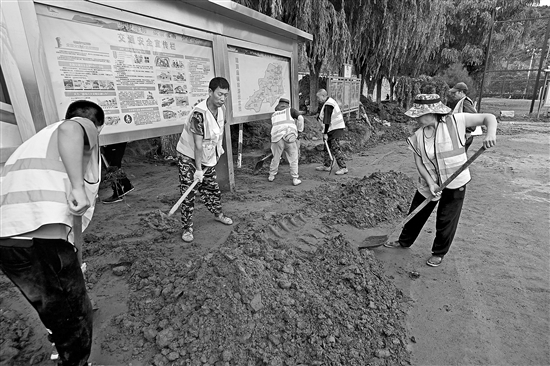 7月31日,北京市怀柔区琉璃庙镇,来自北京建工的职工正在镇政府前的广场上清理淤泥。