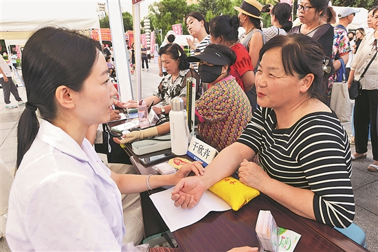7月31日,在黑龙江省牡丹江市首届中医药文化夜市现场,医务人员(左)与问诊市民交流。