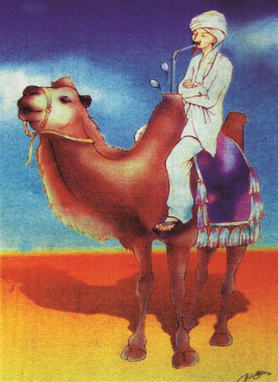 人们对于骆驼始终给予赞颂与好评,它的吃苦耐劳精神还载入课本。看,漫画家又在荒漠大地上“建造”起美味饮品的供应仓。