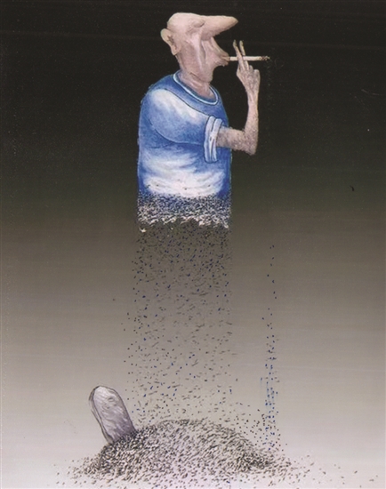抽烟等于慢性自杀。它每天都在腐蚀和消耗着人们的生命。画中瘾君子点点滴滴的肌肤碎屑正堆砌着坟墓。