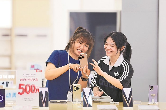 8月1日,四川省乐山市一大型购物商场内,顾客在挑选新款手机。乐山市各大型商场数码消费品以旧换新活动开展以来,有力推动消费增长,尤其是国产数码电子产品可享受“国补”“省补”“厂家补”等优惠补贴政策,促使购买优惠力度进一步加大,吸引众多消费者进店咨询、体验、选购。