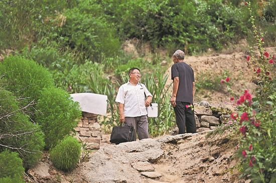 7月23日,在山西省石楼县龙交乡石灰沟村,乡村医生辛平(左)询问村民身体情况。