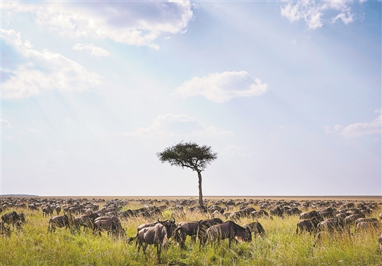 每年7月起,数以百万计的角马、斑马等野生动物为追逐水源和青草,从坦桑尼亚塞伦盖蒂国家公园向北迁徙至肯尼亚马赛马拉国家保护区,途中跨越国境与河流,形成了一条震撼人心的“生命之河”,是东非大草原上的一大自然奇观。这是近日在肯尼亚马赛马拉国家保护区,渡过马拉河的角马在草原上活动。新华社记者 韩旭 摄