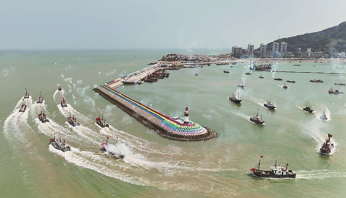 8月5日12时,江苏省连云港市连云区连岛中心渔港,渔民解缆出海,准备奔赴渔场展开捕捞作业。取得专项捕捞资格证的渔船结束为期3个月的海洋伏季休渔,开赴渔场投入渔业生产。
