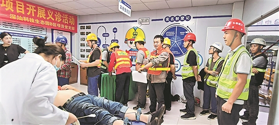 中铁建工华南有限公司粤东分公司深汕科技生态园 B 区项目,每月雷打不动开展免费义诊活动,至今已持续 24 个月。活动期间,医护人员为一线产业工人量血压、做心脏检查,提供疾病预防讲解与咨询。以实际行动守护职工健康,彰显央企担当。时冉冉 摄