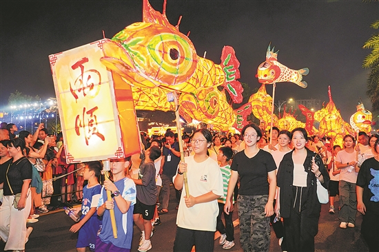 8月7日晚,以“夏夜星河”为主题的非遗奇妙夜在福建省连城县四角井历史文化街区上演,吸引民众前来观赏。图为鱼灯巡游。章宸睿 摄/中新社