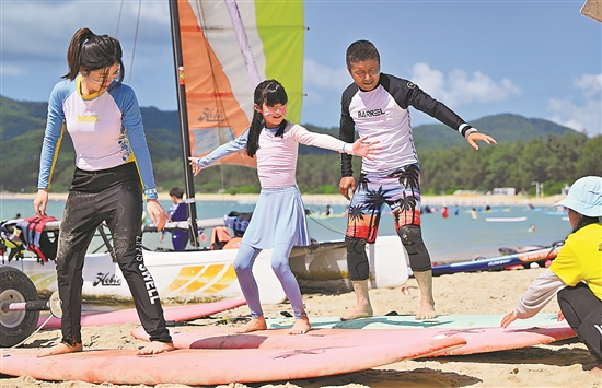 暑期,许多游客来到海南三亚,学习体验冲浪,感受与海共舞的乐趣。新华社记者 郭程 摄