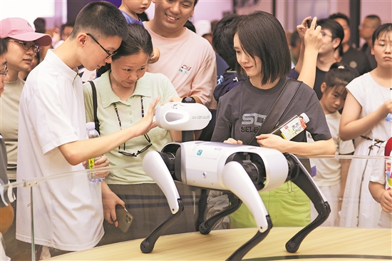 8月10日,在2025世界机器人大会上,观众与智能伴随机器人积极互动。