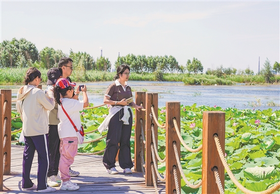 8月10日,游客在玛纳斯国家湿地公园游玩。