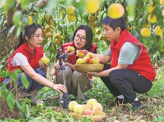 8月11日,贵州省铜仁市玉屏侗族自治县新店镇新店村黄桃种植基地,返乡大学生志愿者通过直播帮助农民推销黄桃。当前,该县种植的黄桃进入全面采收期,大学生们深入田间地头直播销售黄桃,拓宽销售渠道,深受群众赞誉。