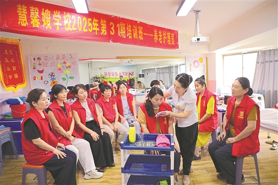 8月13日,在安徽省阜阳市颍东区慧馨嫂职业培训学校内,学员们正在进行养老护理技能培训。近年来,颍东区人社局、区总工会结合市场需求,通过“理论+实操”的方式,免费为有就业需求的返乡农民工、失业人员等群体提供月嫂、家政保姆、养老护理等职业技能培训,帮助他们提升就业技能,拓宽就业增收渠道。本报通讯员 宿飞 李梦雪 摄