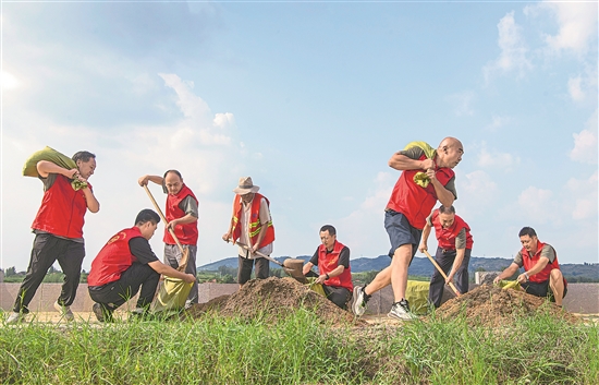 8月11日,在山东省淄博市沂源县悦庄镇东赵庄三村,宋恒春(左四)和镇上的党员抢险突击队一起开展防汛演练。